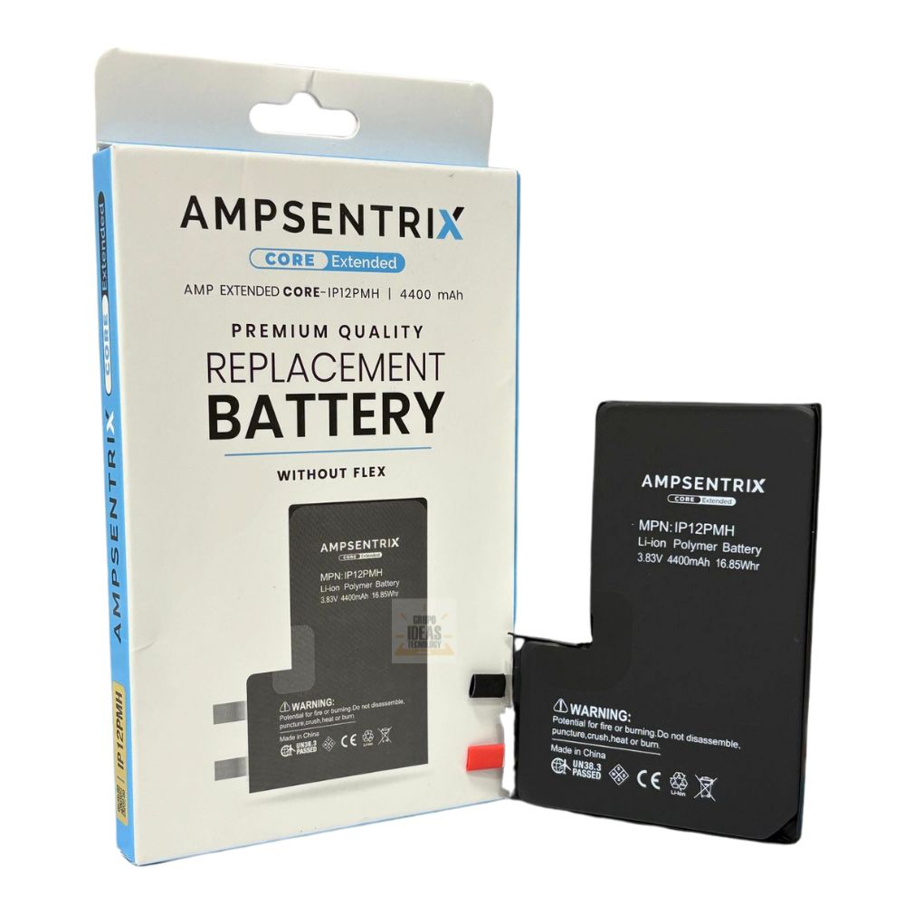 La Batería iPhone 12 Pro Max Ampsentrix Sin Flex ofrece capacidad original, más ciclos de carga y componentes premium. Requiere soldador de puntos.