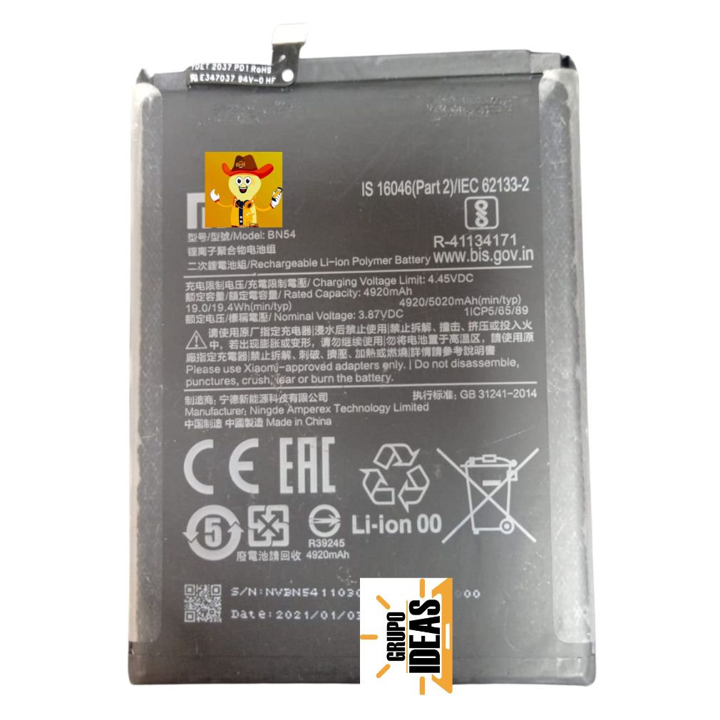 Compatibilidad confirmada con Xiaomi Redmi Note 9 y modelos que utilizan el código de batería BN54. Verifica siempre que tu batería actual tenga este mismo código para garantizar un reemplazo correcto.Características técnicas
