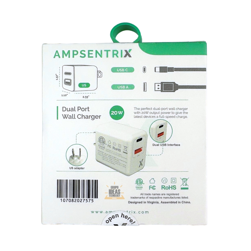El Cargador Ampsentrix 20W de Carga Rápida ofrece una solución segura y eficiente con puertos duales USB-C y USB-A. Compatible con Power Delivery y Quick Charge, es ideal para cargar smartphones y tablets de marcas como Apple, Samsung, Xiaomi y Motorola.
