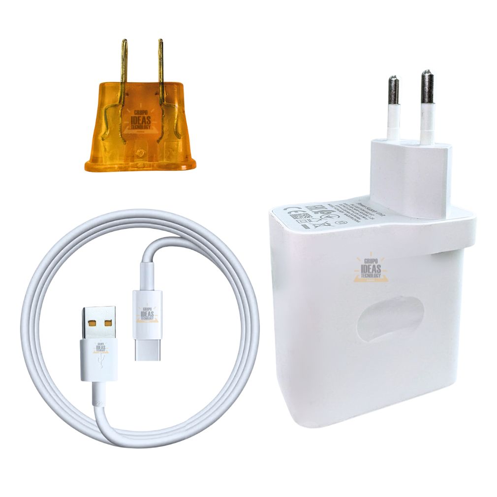 Este producto incluye cable original USB-A a USB-C y adaptador de enchufe europeo a americano, listo para usarse en tomas estándar de América.