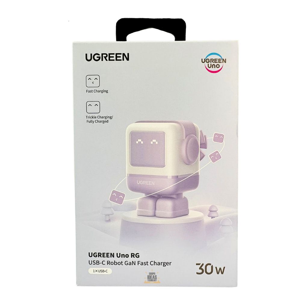 El Cargador Ugreen Mini Robot 30W GaN USB-C Púrpura ofrece carga rápida PD 3.0 en un diseño compacto y creativo. Con tecnología GaNFast, pantalla LED animada y sistema Thermal Guard, es ideal para iPhone, Samsung, iPad y MacBook Air.