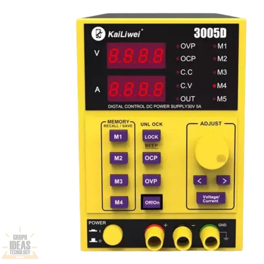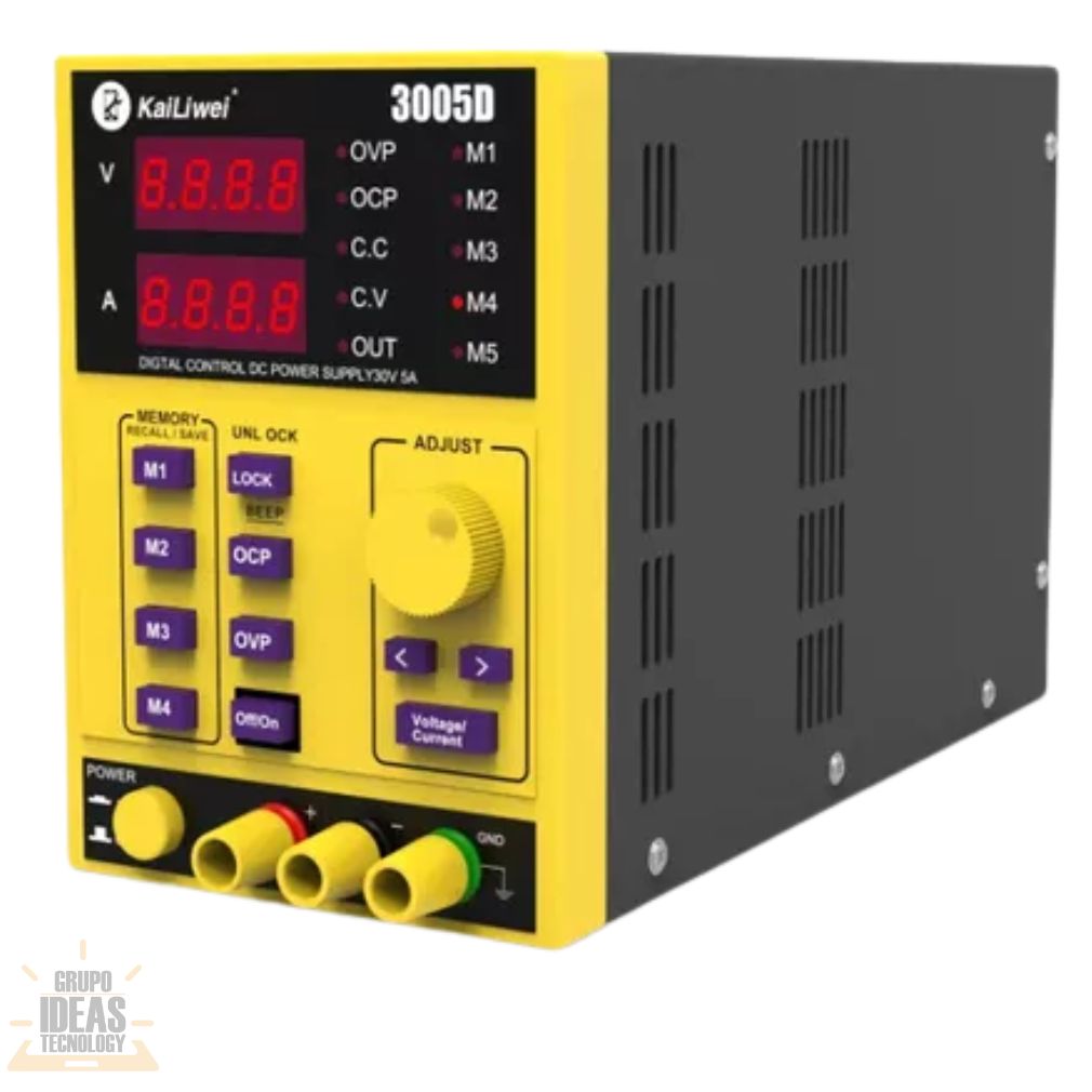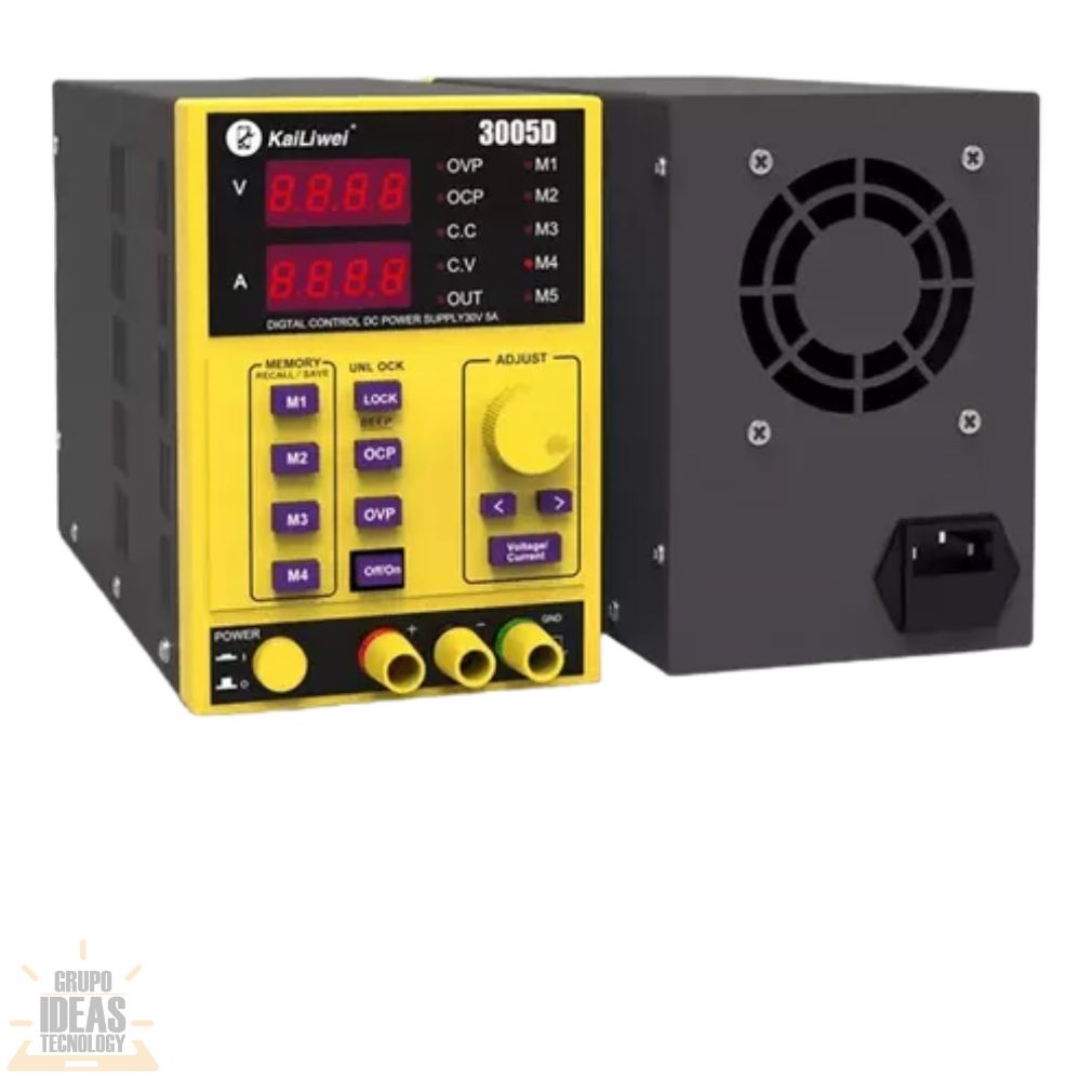 Fuente de Poder Kailiwei 3005D pensada para trabajos de reparación y diagnóstico electrónico que requieren energía estable y control seguro. Permite regular voltaje y corriente con precisión, ideal para dispositivos sensibles.