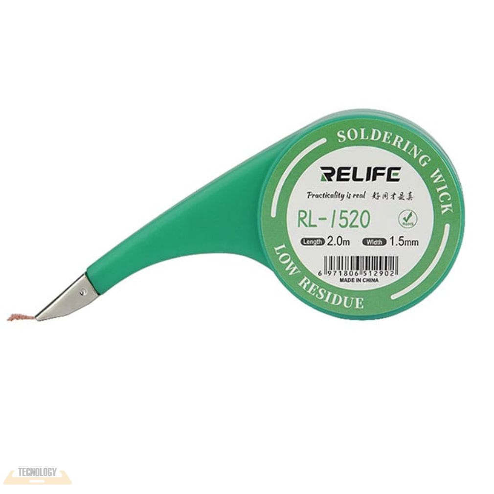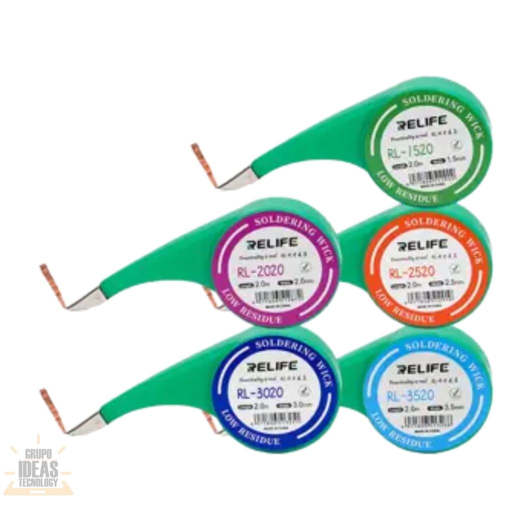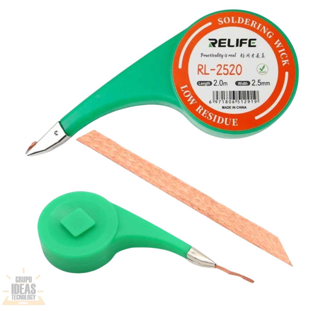 Malla de soldar Relife con dispensador, ideal para desoldado y limpieza de estaño en reparación electrónica. Permite un uso más cómodo, limpio y controlado.