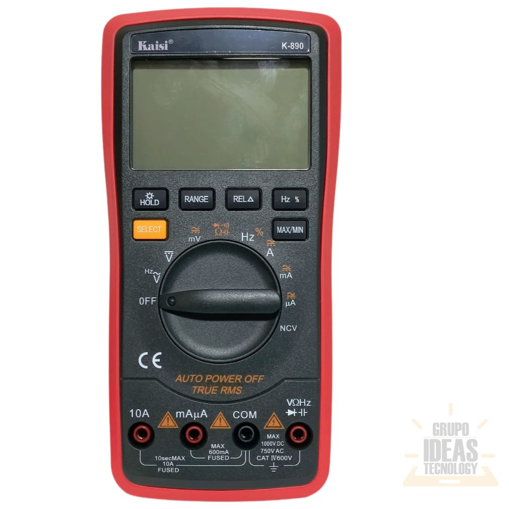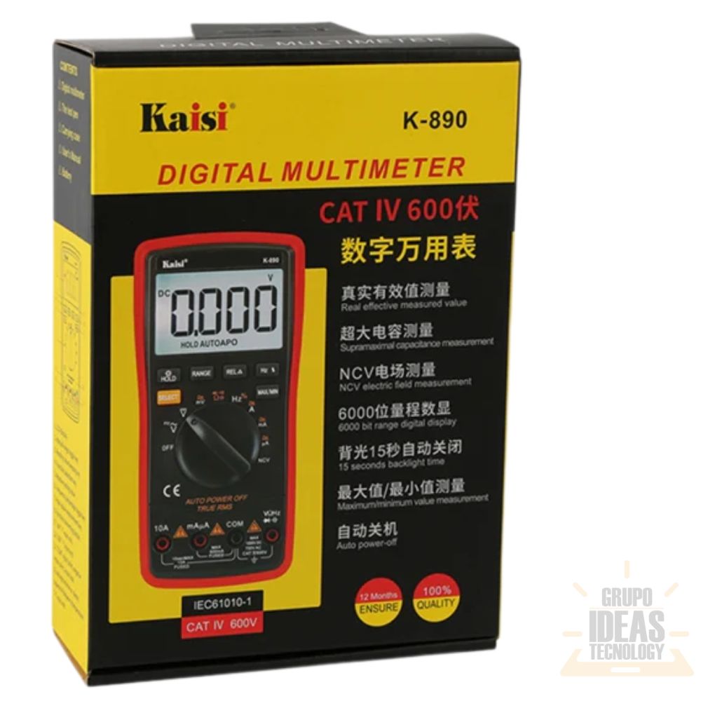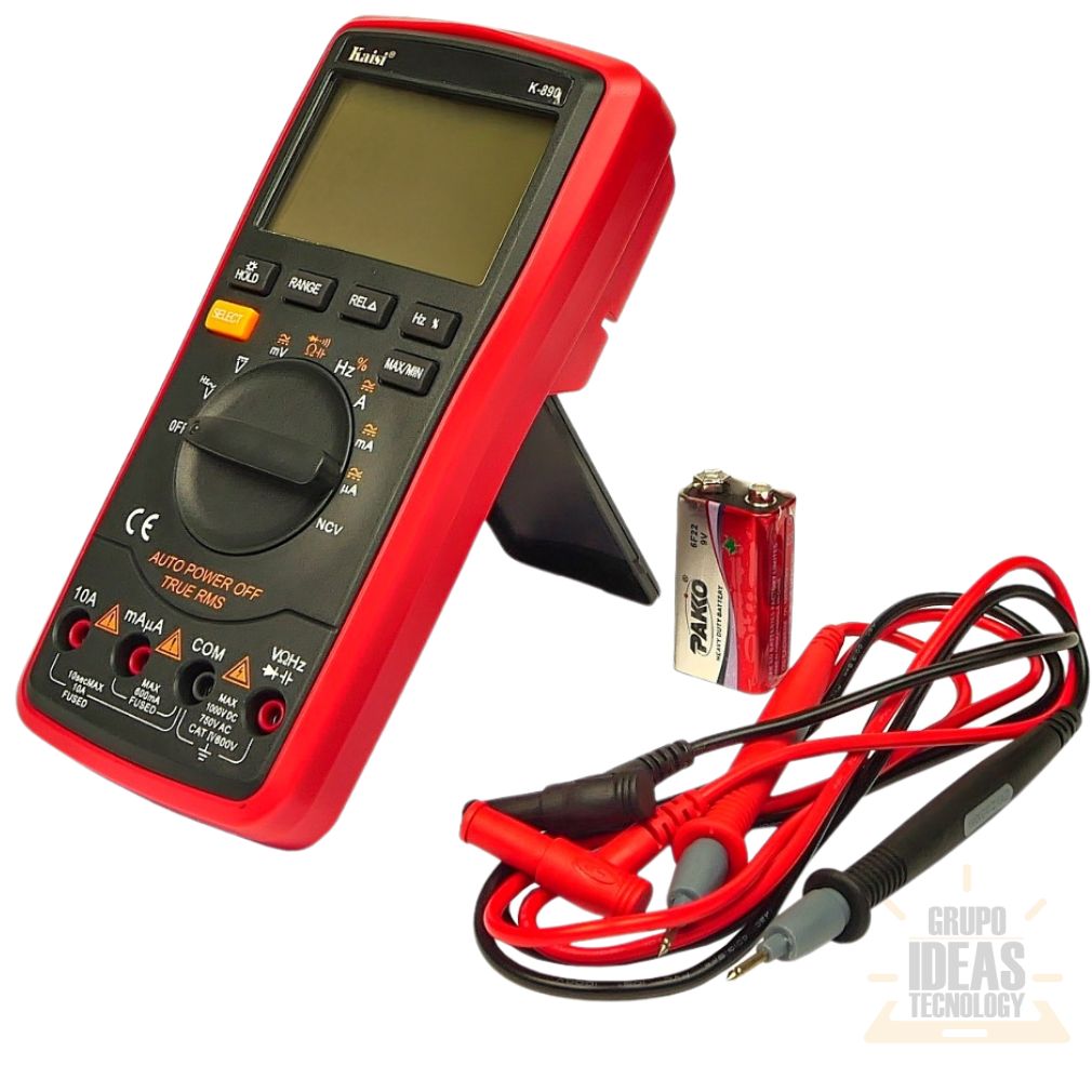 Multímetro Kaisi Autorango K-890 diseñado para realizar mediciones eléctricas precisas en trabajos de reparación, mantenimiento y diagnóstico electrónico. Su función de autorango facilita el uso al seleccionar automáticamente el rango correcto.