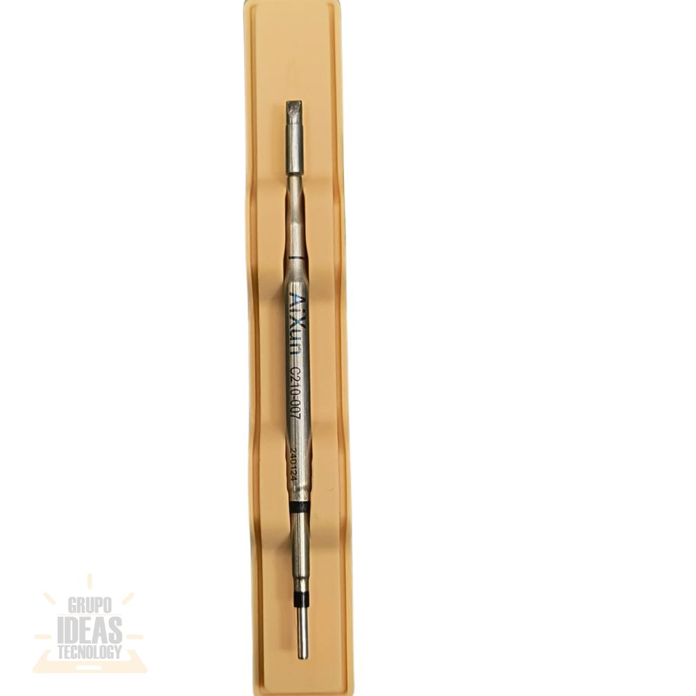 La Punta de Cautín C210 Aixun Tipo Cincel está diseñada para trabajos de soldadura electrónica que requieren una mayor superficie de contacto y una transferencia de calor eficiente. Es ideal para tareas donde se necesita cubrir pads más amplios con precisión.