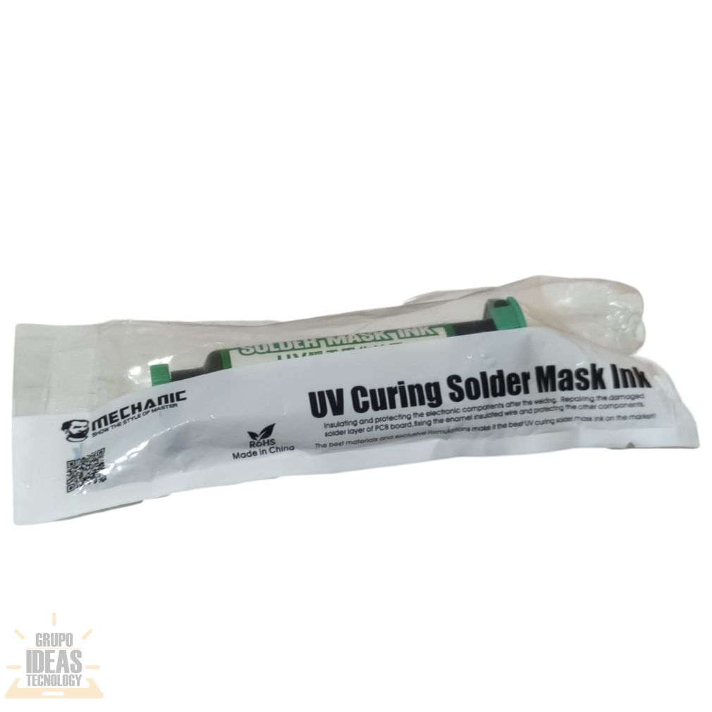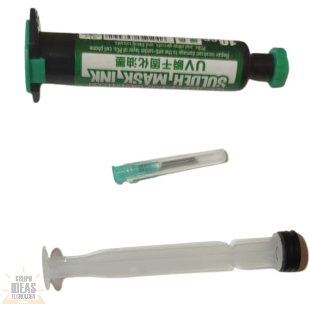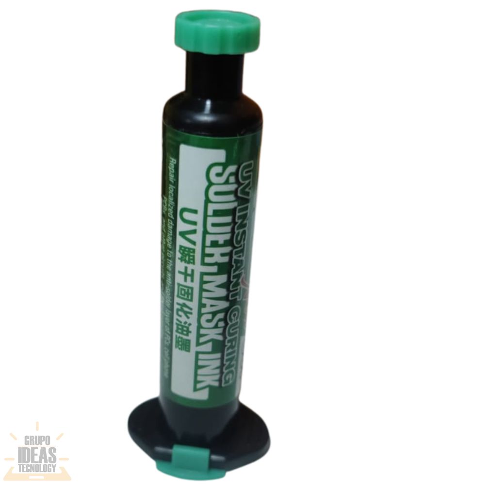 Sellante Máscara UV Verde con curado UV y alta visibilidad. Ideal para proteger pistas y soldaduras en reparación electrónica.