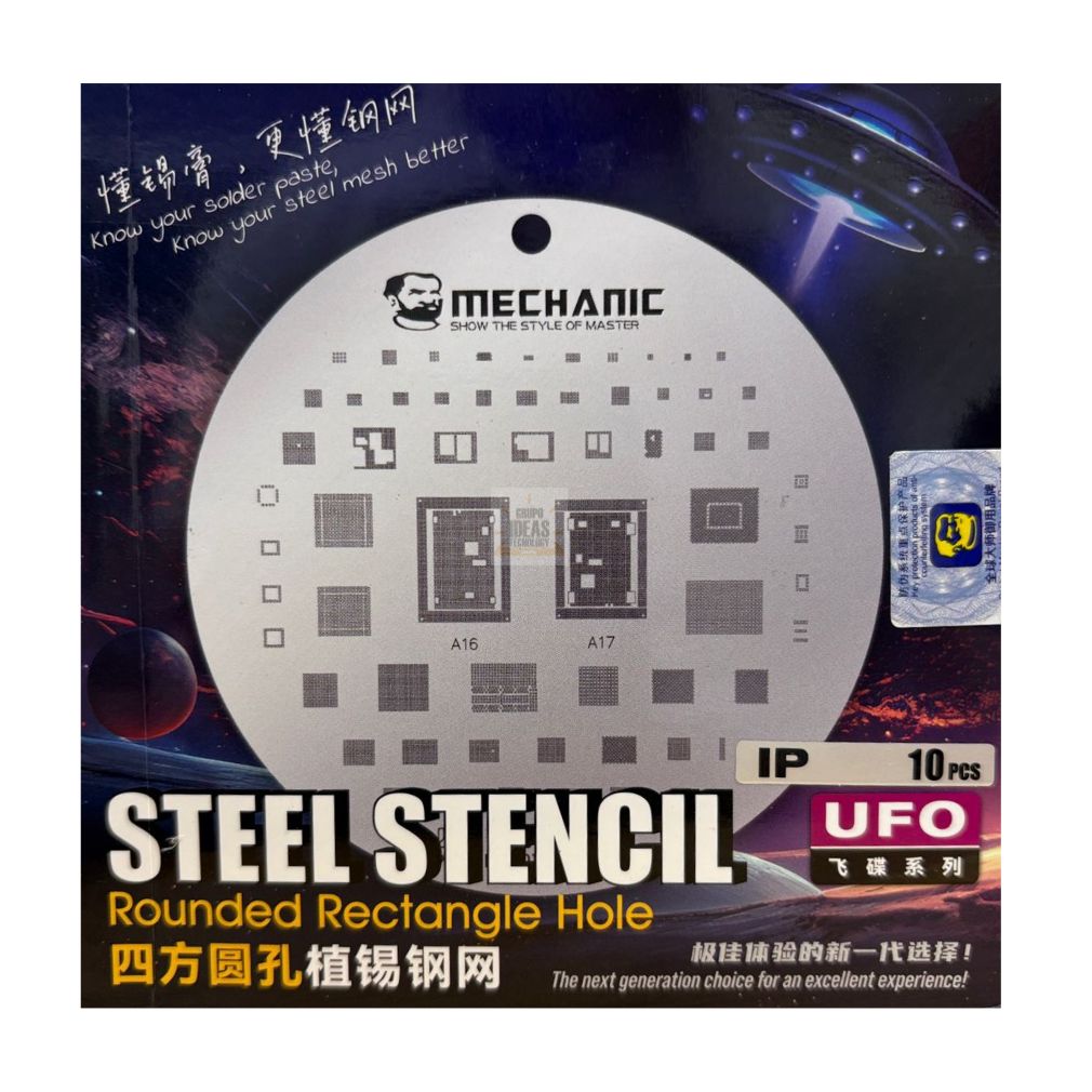 Stencil iPhone 8 – 16 (10 Unidades) es un set profesional para trabajos de reballing y microsoldadura. Está diseñado para dispositivos Apple desde iPhone 8 hasta iPhone 16.Este set ayuda a colocar las esferas de soldadura con precisión. Mantiene el chip bien alineado durante el proceso. Reduce errores y evita retrabajos.El Stencil iPhone está fabricado en acero resistente. Soporta altas temperaturas sin deformarse. Es ideal para uso continuo en talleres técnicos.Cada stencil tiene cortes precisos. Permite distribuir el estaño de forma uniforme. El resultado son soldaduras limpias y bien definidas.El set incluye 10 unidades. Ofrece compatibilidad con varios modelos de iPhone. Es una herramienta esencial para técnicos especializados en reparación de placas base.Facilita trabajos complejos. Ahorra tiempo. Mejora la calidad final del reballing.