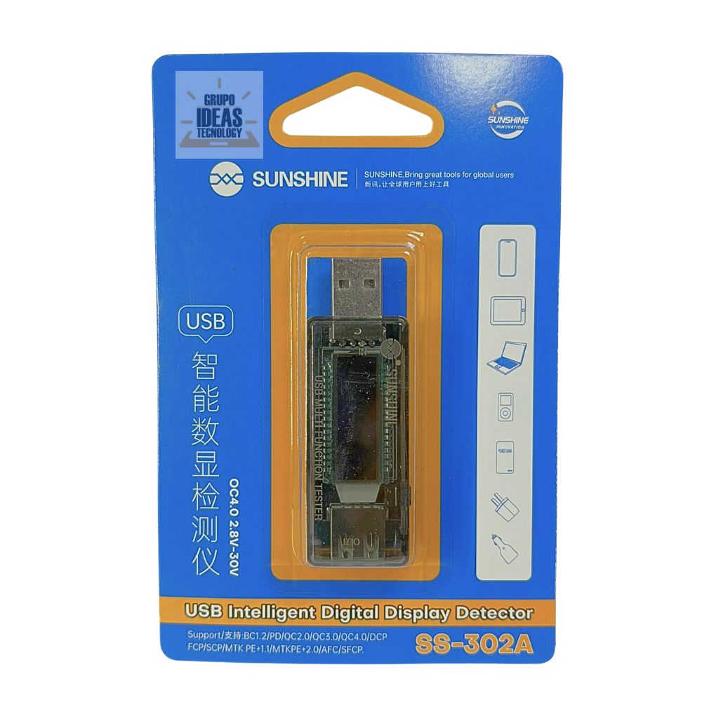 USB Tester Sunshine SS-302A para medir voltaje y corriente; diagnóstico rápido de cargadores y cables USB.